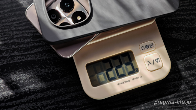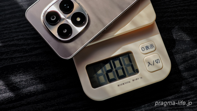 REDMI Note 15 Pro 5Gの本体は実測で約201gでした。公称より1g重いのは、画面にあらかじめ添付してあるフィルム分でしょうか。