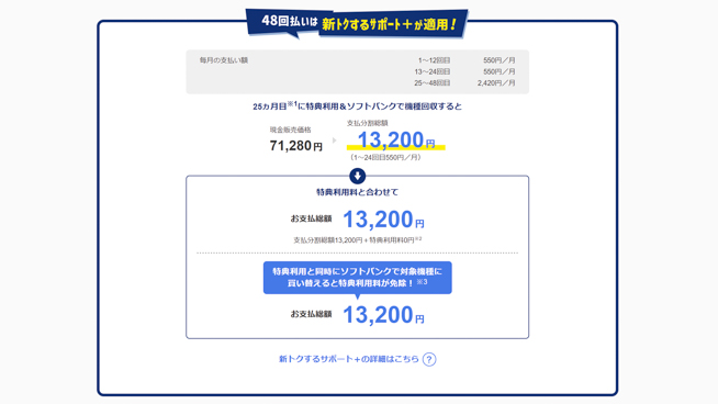 ※「新トクするサポート+」の「特典利用料」および「早期利用料(特典Aのみ)」は機種・ストレージ容量・時期・契約種別などによって異なる場合があります。「特典利用料」および「早期利用料(特典Aのみ)」の金額は変更される場合があります。それぞれの対象機種、プログラム詳細及び最新の価格はソフトバンクの公式ウェブサイト(https://www.softbank.jp/mobile/products/new-tokusuru-support-plus/)をご確認ください。