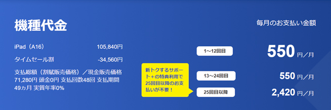 例えば「iPad(A16)」の128GBモデルなら税込550円/月で約2年間利用可能。以上のプラン利用料を合わせても税込1,540円/月です。