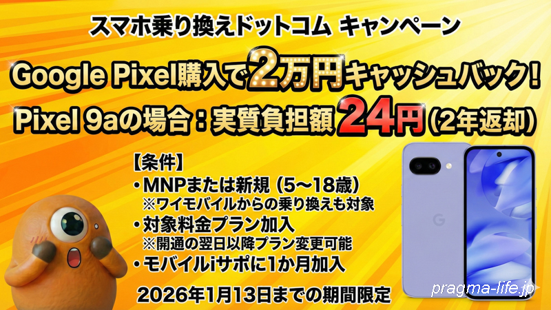 WEB上のソフトバンク正規代理店スマホ乗り換え.comにて、同店にて取り扱うGoogle Pixel系商品全般(Pixel 10シリーズ、Pixel 9a等)がお得に購入できるキャンペーンが始まったのでご紹介します。