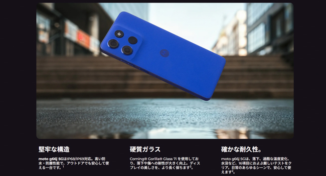 moto g66j 5G / g66y 5GはIP68/IP69の防塵防水に対応しており、最深1.5メートルの水中に落とした場合でも最長30分間耐えることができるといいます。