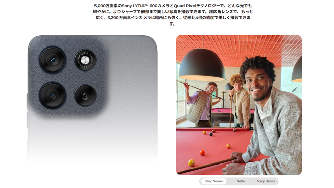 moto g66j 5G / g66y 5Gは、背面に5000万画素メイン+800万画素超広角のデュアルカメラを搭載しています。