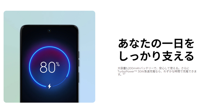 moto g66j 5G / g66y 5Gは、5200mAh大容量バッテリーを搭載しており、一日しっかりバッテリーが持続するとのこと。