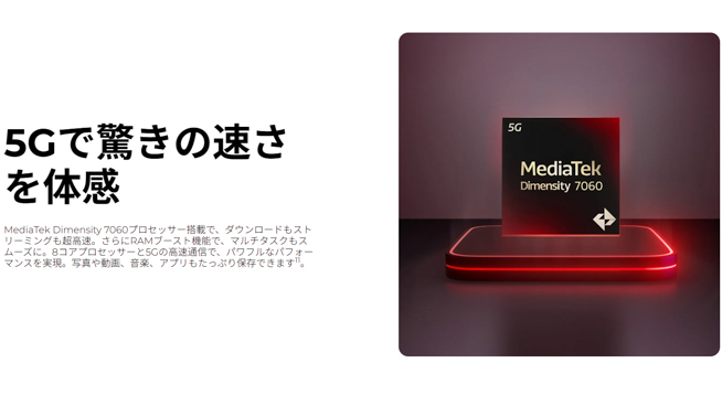 moto g66j 5G / g66y 5Gは、ミドルクラスのメディアテック製SoC「Dimensity 7060」を搭載しています。