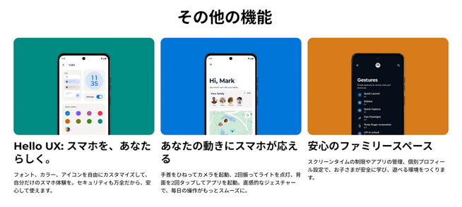 また、フォント、カラー、アイコンを自分好みにカスタマイズできる「Hello UX」機能や、手首をひねってカメラを開いたり、2回振り下ろしてフラッシュライトを点灯させたりなど直感的にスマホを使えるジェスチャー機能などに対応しています。