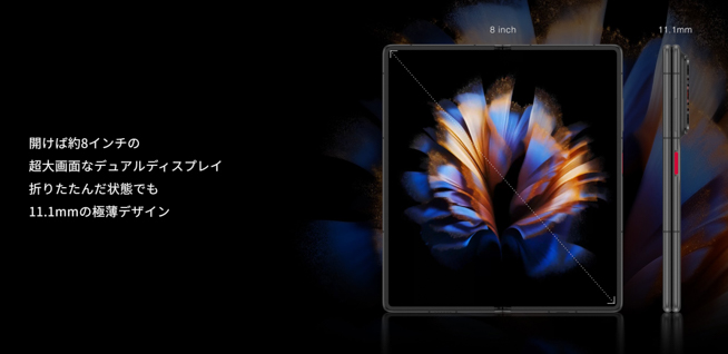 ディスプレイには、開くと約8.0インチのメインディスプレイ(解像度2,480×2,200ピクセル、フルHD + LTPS)と、閉じた状態で使用する約6.5インチのカバーディスプレイ(解像度2,748×1,172ピクセル)を搭載しており、内側も外側も高解像度で没入感のあるデュアルディスプレイを楽しめるとのこと。
