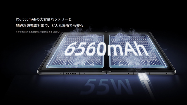 バッテリーに関しては、6,560mAhの大容量バッテリーを搭載しており、長時間の動画視聴やゲームも安心とのこと。