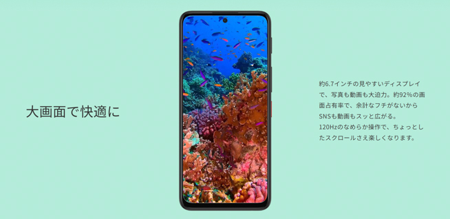 解像度はFHD+(2,400×1,080)で、エントリーモデルとしては高い画面占有率(92%)により、優れた没入感を実現。SNSのチェックや動画視聴も快適に楽しめるとのこと。
