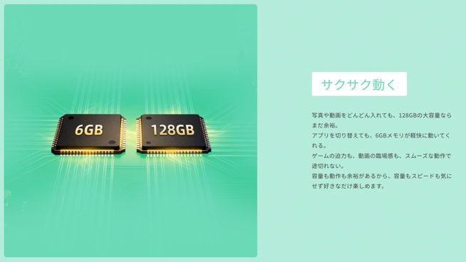 メモリは6GB、ストレージ128GBとなっており、外部メモリとしてmicro SDXCカード(最大1TB)によるストレージ拡張に対応しています。