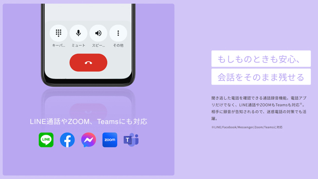 また、高機能通話録音機能も特徴的で、通常の電話に加え、LINE通話やFacebook、Messenger、Zoom、Teamsといった様々なアプリでの通話録音に対応。