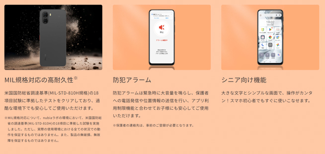 家族層やシニア層を意識した機能として、防犯アラーム機能を含むジュニアモードや、大きな文字とシンプルな画面のシニア向けシンプル画面が搭載されています。