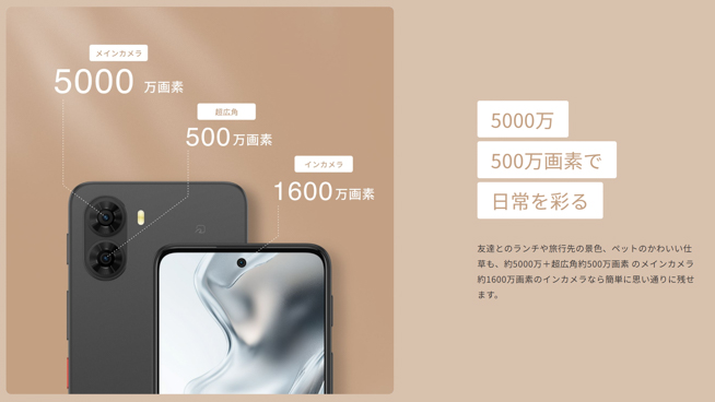 nubia S2のカメラ機能では、メインカメラに約5,000万画素のセンサー、超広角カメラに500万画素のセンサーを採用。