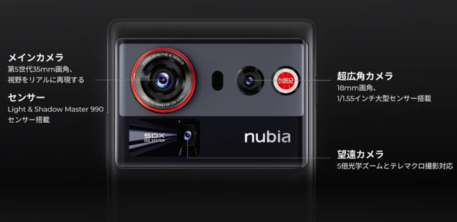 メモリ構成は16GB(LPDDR5X)、ストレージは512GB(UFS 4.1)となっており、オペレーティングシステムには、Android 16をベースにnubia独自のAIを統合した「MyOS」が搭載されています。