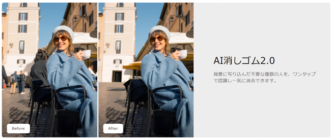 • AI消しゴム2.0:背景に写り込んだ不要な複数の人を、ワンタップで認識し一気に消去。