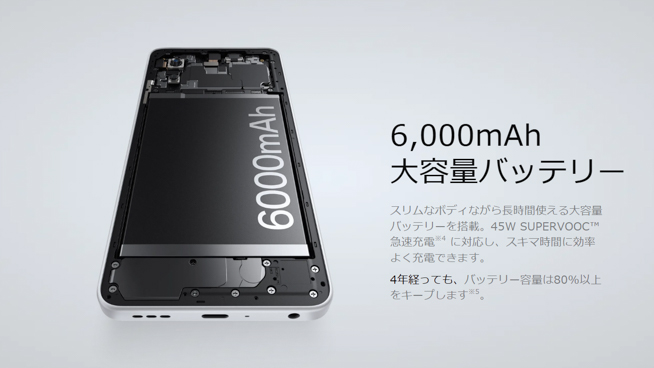 OPPO A5 5Gは、スリムなボディながら公称値で6,000mAhの大容量バッテリーを搭載しており、長時間使用が可能とのこと。
