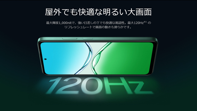 解像度はHD+(1,604×720)と最低限ですが、リフレッシュレートは最大120Hzに対応しており、滑らかな表示が楽しめることでしょう。