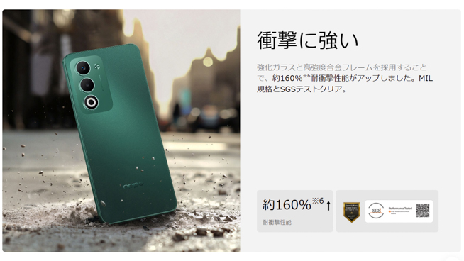 耐久性にも優れており、強化ガラスと高強度合金フレームの採用により耐衝撃性能がOPPO A3 5Gと比較して約160%アップしているとのこと。MIL規格(MIL-STD-810H)とSGSテストをクリアする耐衝撃性を備えています。