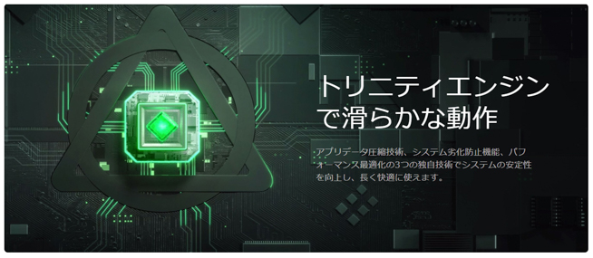 さらに、アプリデータ圧縮技術、システム劣化防止機能、パフォーマンス最適化の3つの独自技術からなる「トリニティエンジン」を搭載しており、システムの安定性を向上させ、長く快適に使えるとのことです。