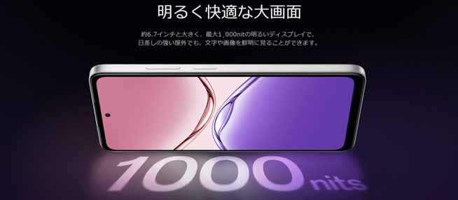 | 画面 | 約6.7インチ LCD, HD+(1,604×720), 最大90Hzリフレッシュレート, 日光下での最大輝度1,000nits |