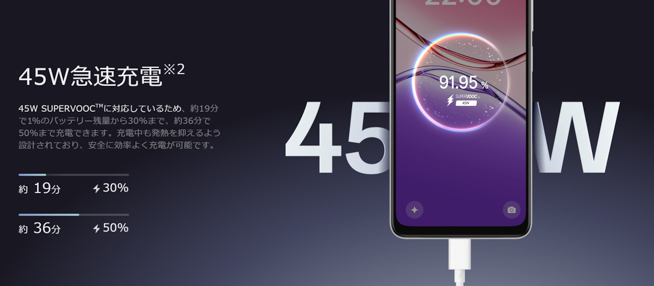 充電では、OPPO独自規格の「45W SUPERVOOC」に対応していおり、約19分で1%のバッテリー残量から30%まで、約36分で50%まで充電できるとのこと。また、一般的な33W PPS等にも対応しています。