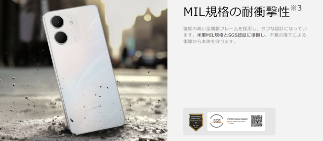 OPPO A5xは、MIL規格の耐衝撃性に準拠しており、不意の落下による衝撃から本体を保護。さらにIP65の防塵・防水性能(耐噴流)を備えており、雨の日の通勤・通学でも安心して使えると謳っています。