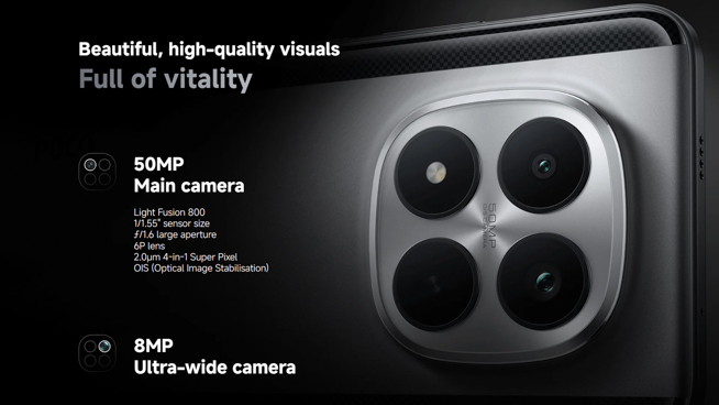 POCO M8 Pro 5Gは、5000万画素メイン+800万画素超広角のデュアルカメラを搭載しています。