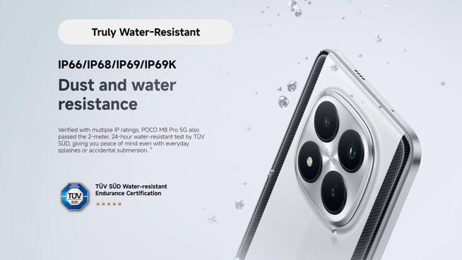 POCO M8 Pro 5G 発表!Snapdragon 7s Gen 4搭載のミドルハイモデル。IP69Kの強力な防水に対応