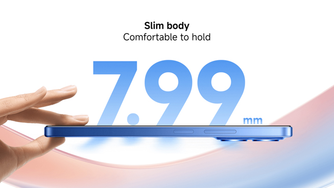 Redmi 15Cの本体寸法は、縦が約171.56mm、横が約79.47mm、厚さが約7.99mm、重量は約205g。