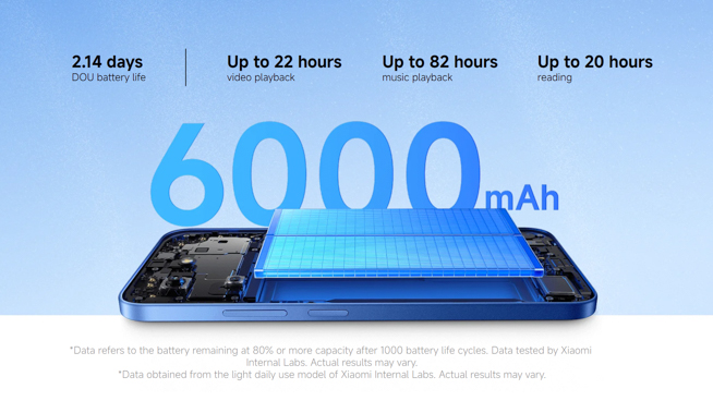 Redmi 15Cは、8mmを切るという薄型形状でありながら、バッテリーは6000mAhもの大容量を実現。