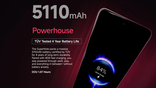 Redmi Note 14 SE 5Gは、45W急速充電対応の5110mAh大容量バッテリーを搭載しています。