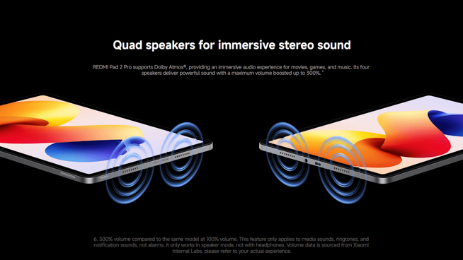 また、音響面ではDolby Atmos対応のクアッドステレオスピーカーを搭載し、最大300%の大音量モードにも対応。