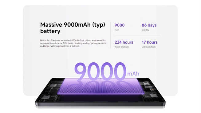 バッテリー持続時間もRedmi Pad 2 / 2 4Gの大きな魅力の一つで、9000mAhの大容量バッテリーを備えており、Wi-Fi版で最大17時間、4G版で最大19時間もの動画再生が可能とのこと。