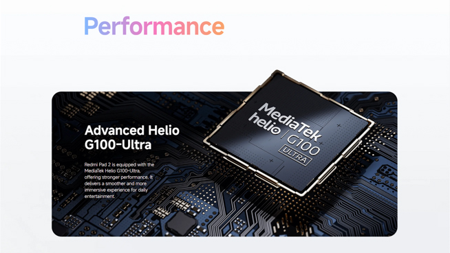 Redmi Pad 2 / 2 4Gは、メディアテック製のSoC「Helio G100-Ultra」を搭載。
