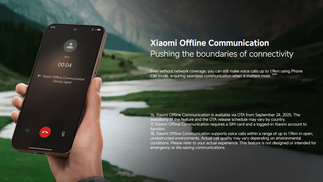 その他、ネットワークの電波が届かない場所でも、最大1.3kmまで音声通話が可能という「Xiaomi オフラインコミュニケーション」に対応。