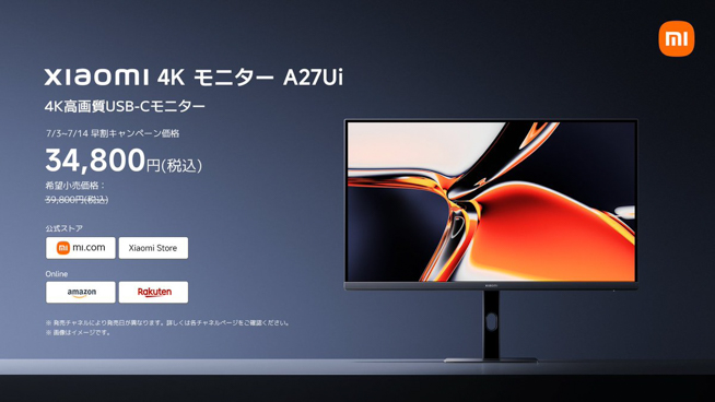 2025年7月3日、シャオミ・ジャパンは「Xiaomi 4K モニター A27Ui」を発売しました。