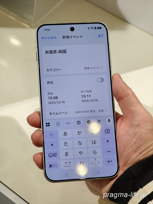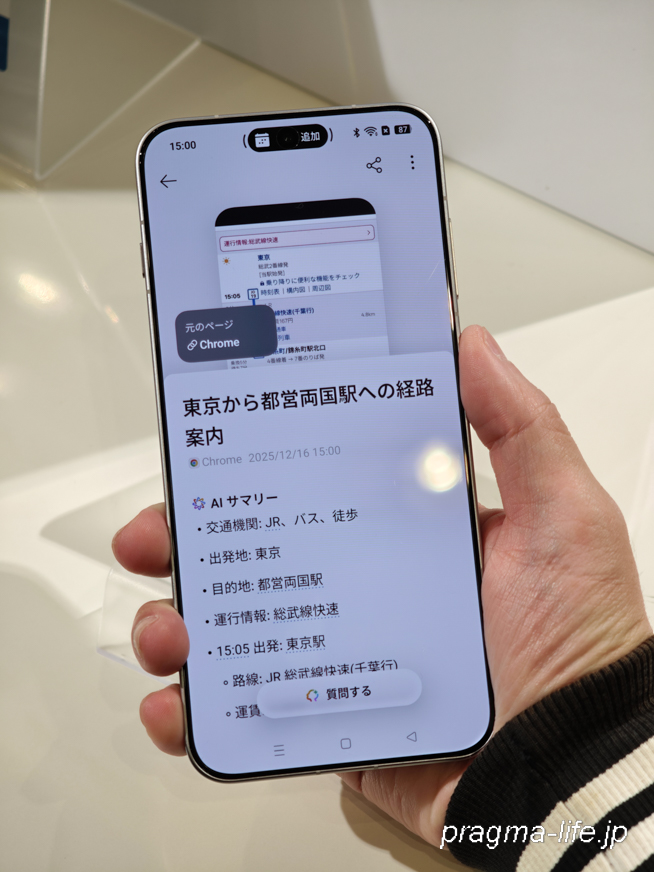 デモで体験したのは、電車の乗り換え案内画面のスクリーンショットを撮るという動作。なんと、スクショを撮ってスナップキーを押すと、瞬時にAIが画像内の日時や場所を解析し、連携しているGoogleカレンダーに予定の登録を提案してくれたのです。