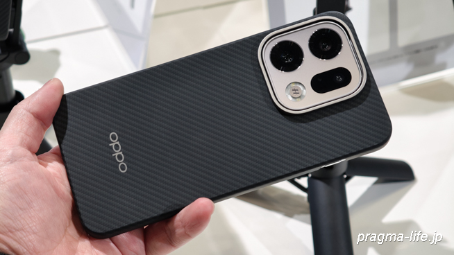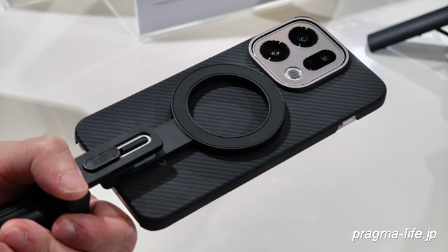 展示されていた純正ケースはアラミド繊維製のものでした。カーボン調のパターンはシックで落ち着いており、本体のデザインを損なわない薄さと頑丈さを兼ね備えています。