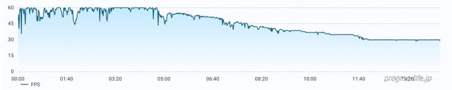 この場合だと、60FPSで動いたのは最初の5分だけで徐々にFPSが低下。最終的には30FPSの上限制限がかかってしまいました。