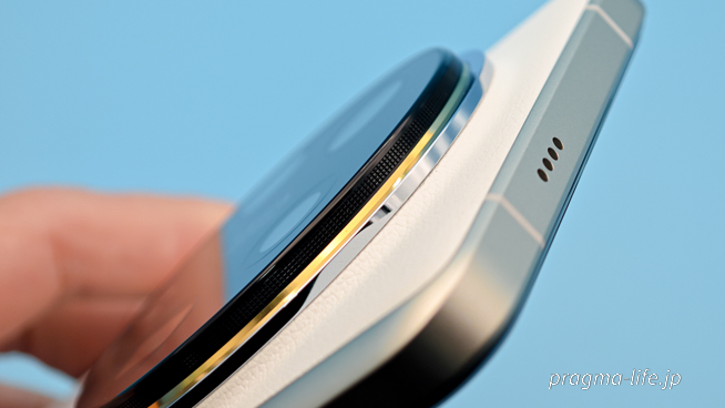 さらに特徴的なのは、背面に回り込んだミドルフレームで、ここが大きく湾曲しているおかげで、手の小さな筆者でもかなり持ちやすいです。