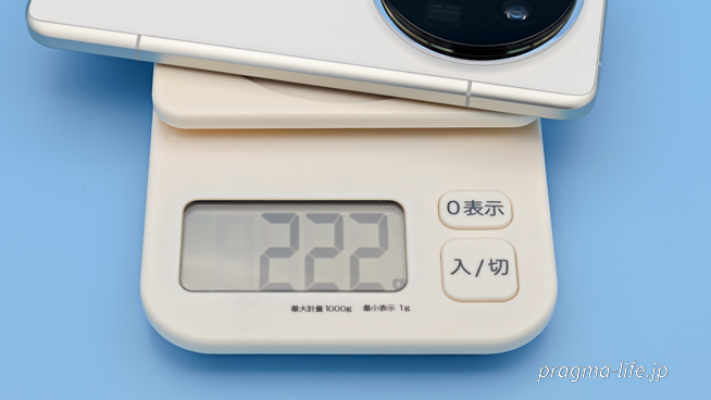重量は実測で約222gでした。カメラフラッグシップと呼ばれるようなジャンルのスマホとしては、それほど重いわけではありません。