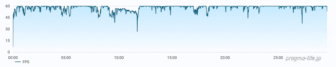 結果は、一時的に少しだけ不安定になる場面があったものの、ほぼ60に近いFPSを維持することができ快適なゲームプレイが可能でした。