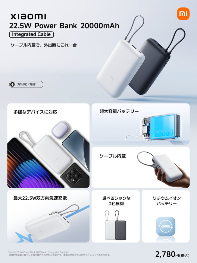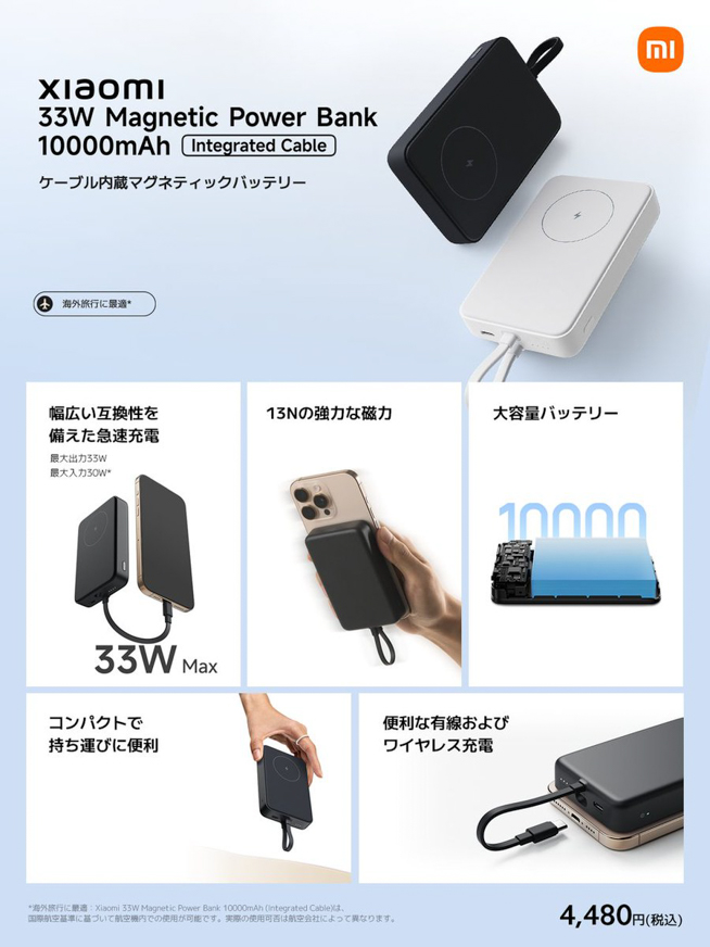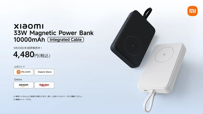 2025年5月20日、シャオミ・ジャパンはモバイルバッテリー「Xiaomi 33W Magnetic Power Bank 10000mAh (Integrated Cable)」「Xiaomi 22.5W Power Bank 20000mAh (Integrated Cable)」の2製品を日本向けに発表しました。