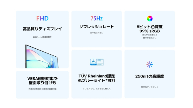その他、HDMIポートやVGAポート、VESA規格(75 x 75mm)に対応しており、高い利便性を持っています(※壁面取り付けブラケットは別売り)。