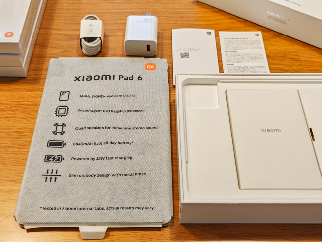 充電器は33W対応。前モデルXiaomi Pad 5も33W充電自体には対応していたようですが、付属充電器は高出力のものではありませんでした。Xiaomi Pad 6は本体はもちろん付属品もパワーアップしています。