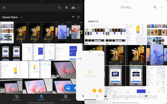 もちろん画面分割とフローティングウインドウを組み合わせて使うことも可能。筆者はギャラリーアプリとLightroom、場合によってはメモアプリも同時に開いて、保存してある画像の整理等をしたりしています。