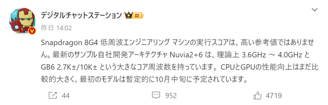また、中国の著名なリーカー「数码闲聊站(デジタルチャットステーション)」氏のWeiboでの投稿によると、Snapdragon 8 Gen 4を搭載した最初の製品は10月中旬の発表が予定されているとのこと。