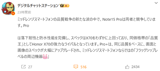 また、REDMI Note 15 Proは今年7月に中国で発表された「Honor X70」の強力な競合機種になると伝えています。