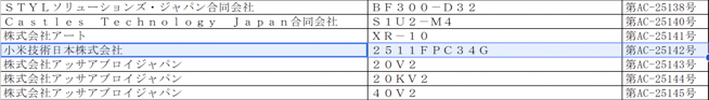 総務省が更新した「誘導式読み書き通信設備」の型式指定公示において、小米技術日本が申請した「2511FPC34G」という型番が掲載されていることが確認されました。