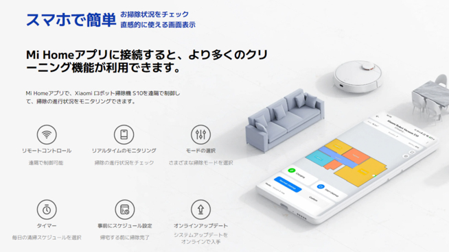 アプリを使うことでより多くのクリーニング機能が利用可能。また、Xiaomi ロボット掃除機 S10を遠隔制御して、掃除の進行状況もモニタリングできるとのことです。