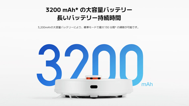 バッテリーは3200mAhもの大容量となっており、長くバッテリーが持続。標準モードでは最大130分間の掃除が可能といいます。